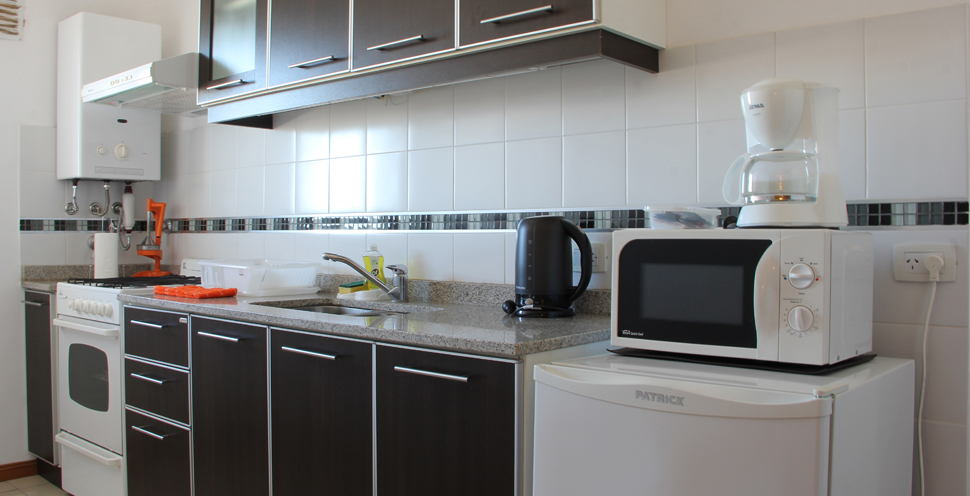 Cocina c/horno, Heladera, pava eléctrica, tostadora, cafetera y Vajilla completa para 4 personas.